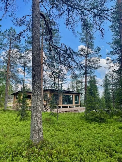 When you enter our cosy log cabin, the view opens directly into the cabin, which has a fully equipped kitchen and a dining set for six people. The bright living room has large windows throughout the room, and from the couch you can admire the forested landscape.